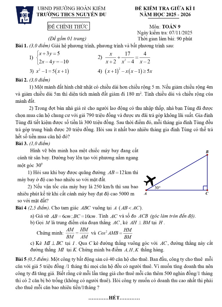 Đề thi giữa học kì 1 môn Toán lớp 9 THCS Nguyễn Du 2025 - 2026 dành cho các em học sinh lớp 9 tham khảo và ôn tập kiến thức.