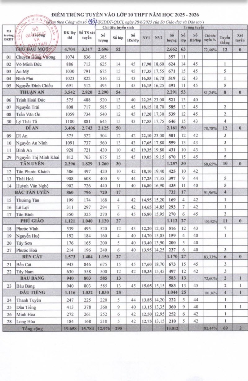 Điểm chuẩn vào lớp 10 năm 2025 Bình Dương