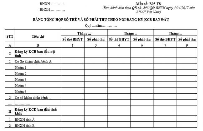 Mẫu bảng tổng hợp số thẻ và số phải thu theo nơi đăng ký KCB ban đầu hay còn gọi là mẫu số B05-TS là mẫu bảng tổng hợp được BHXH tỉnh, huyện lập ra để tổng hợp số thẻ, số phải thu theo nơi đăng ký khám chữa bệnh ban đầu để phân quỹ khám chữa bệnh. Mẫu bảng tổng hợp được lập theo quý hoặc năm và cần phải nêu rõ thông tin tiêu chí tổng hợp cùng thời gian tổng hợp.